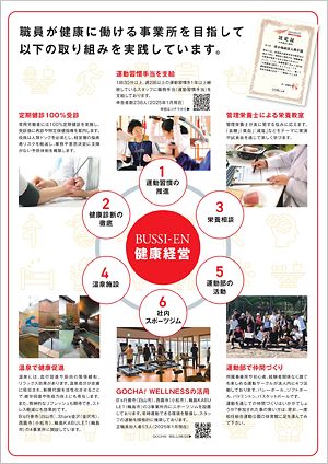具体的には、毎年の健康診断はもちろん、栄養士職員による栄養指導や、健康づくりのサポートとして「運動習慣手当」の支給のほか、拠点にある「入浴施設」や「ゴッチャ!ウェルネス」を職員も利用できる環境を整えています。